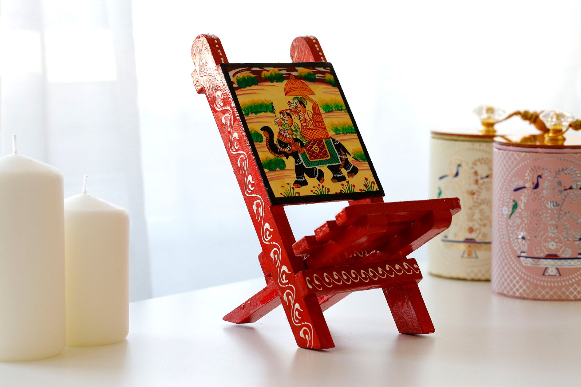 Rajasthani Art Work Handcrafted Wooden Folding Small Chair Mobile Stand Red
